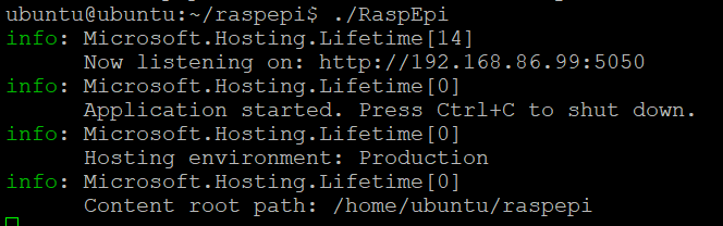 - By default, the site is set to run on http://localhost:5000. Technically that would be fine, but I'd also like to access it from another host - like http://[my-pi's-IP]:[some port]. This can easily be achieved in program.cs, by adding a hosting url programmatically.