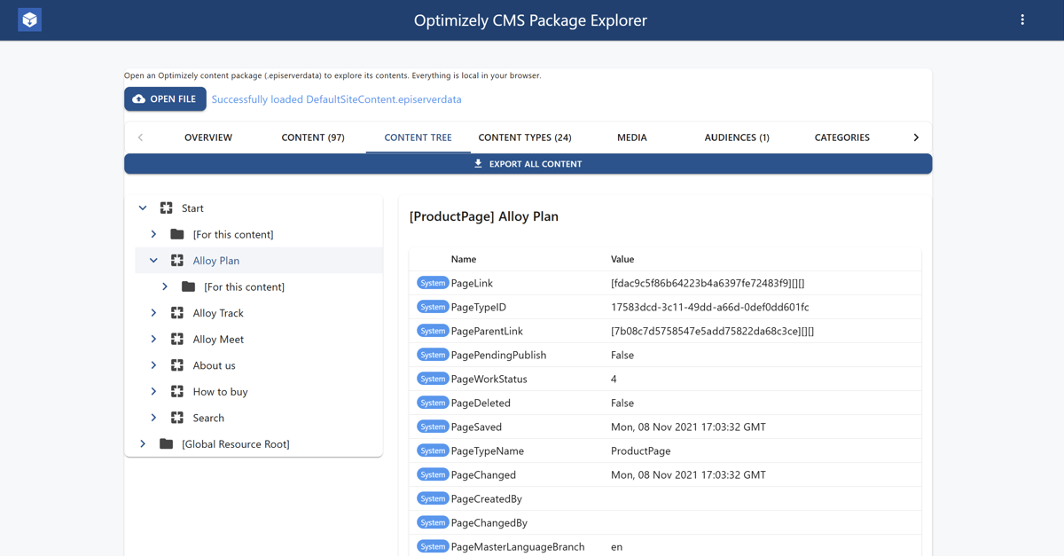 .episerverdataformat – The tool remains focused on those export/import packages used in Optimizely / Episerver workflows. - Browser-only, zero backend required – Your data stays local. We run entirely in your browser (Blazor WebAssembly) so upload, inspect — without worrying about data leaving your machine.